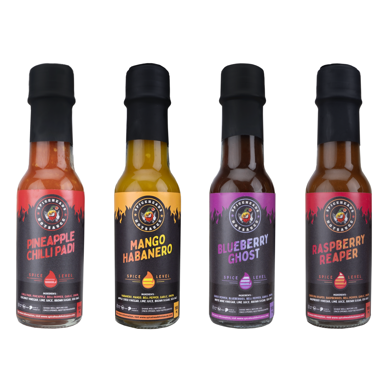 Our quadro set includes our best selling Mango Habanero, the smoky and savoury Blueberry Ghost , the fruity and fiery Raspberry Reaper, along with our limited drop Pineapple Chilli Padi, which was specially made to commemorate Chinese New Year.